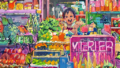 チーズがちりばめられて濃厚そうなエビチリ料理のイラスト、野菜も彩り豊かなのが豊富、レストランで出された料理なのかな
