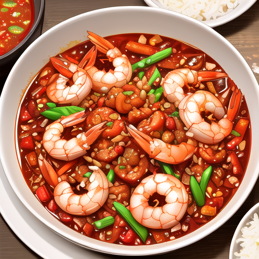 野菜たっぷりのエビチリ料理、なかなか食べ応えがありそう、中華料理好きにはたまらない
